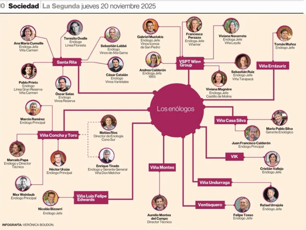 La infografía muestra a enólogos jefes, directores técnicos y figuras históricas de casas como Viña Concha y Toro, Santa Rita, Errázuriz, Montes, Casa Silva, Almaviva, Viu Manent, VIK, Undurraga, Ventisquero y más. Muchos de ellos son los responsables de algunos de los vinos más premiados y buscados de Chile.